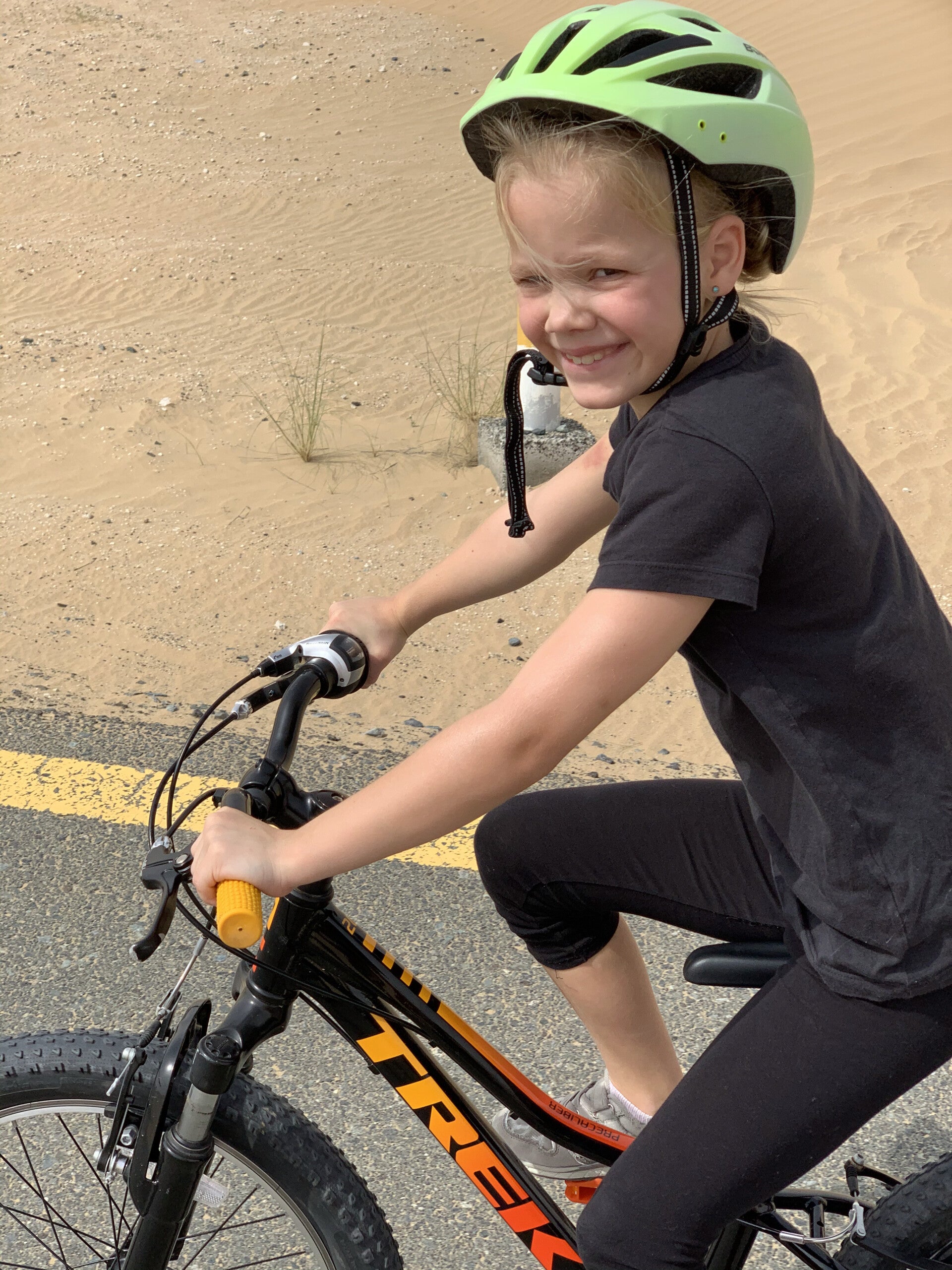 Cyclists enjoy wide, smooth asphalt paths set against scenic desert landscapes, including dunes, open plains, and lakes.