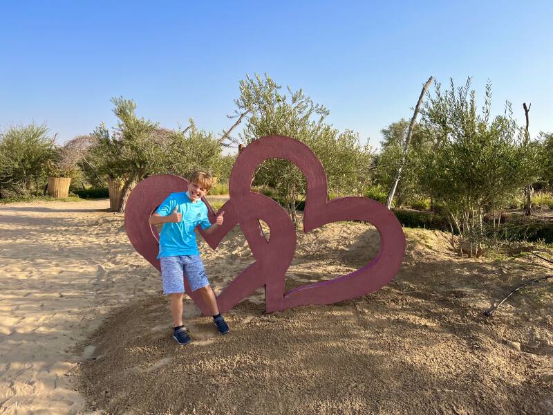 The area is adorned with artistic landscaping and nature-inspired installations—most prominently heart-shaped designs, but also wooden sculptures, swings, and birdhouses—making it a perfect spot for photography.
