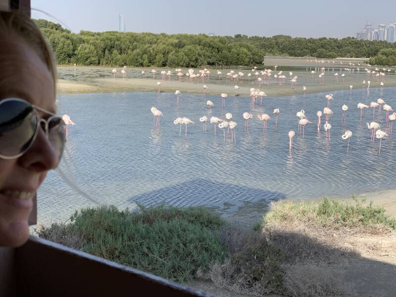 Ras al Khor is a nature preservation area with mangroves and lagoons, connected to Dubai Creek, and home to a large population of flamingos. On several places there are 'hide viewing areas' created, which you can access through open air walking tunnels. It is a fantastic sight, all these elegant high-legged pink birds together with in the background the skyline of Dubai. A big contrast! We loved the piece and quietness.