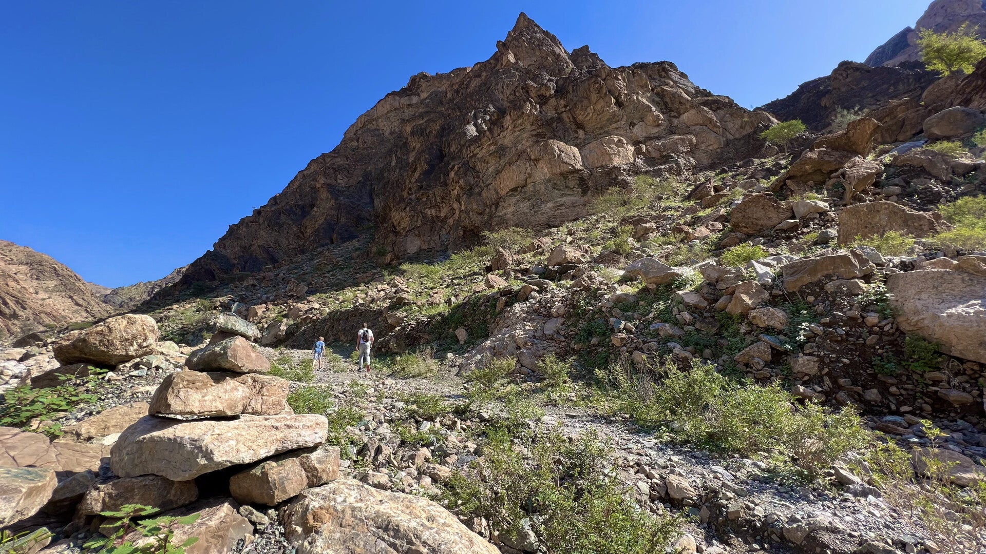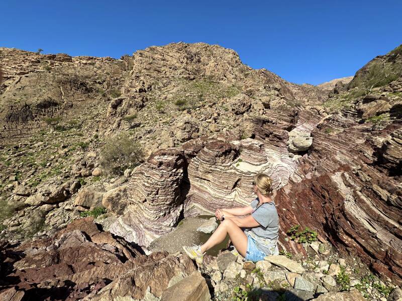 We hiked all the way to the viewpoint with the lovely layered rock formations and a little water wadi. I guess, it was about 2 km one way.