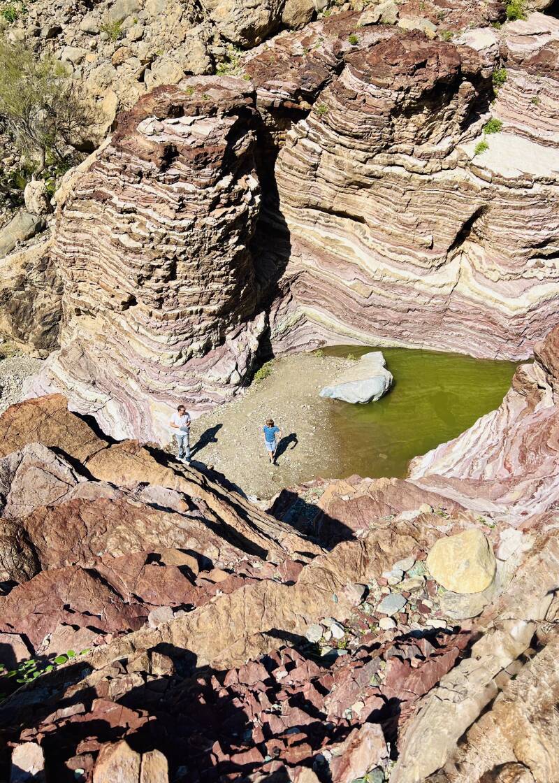 At the end of the hike, we were surrounded by high rocks in an overwhelming wave of color. This colorful valley is formed by layers of multi-colored rocks (it looks like pancakes) that make their way through the wadi. To us, it felt we were on another planet.