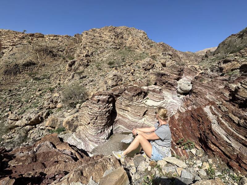 At the end of the hike, we were surrounded by high rocks in an overwhelming wave of color. This colorful valley is formed by layers of multi-colored rocks (it looks like pancakes) that make their way through the wadi. To us, it felt we were on another planet. We hiked all the way to the viewpoint with the lovely layered rock formations and a little water wadi. I guess, it was about 2 km one way.