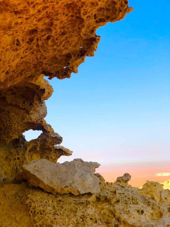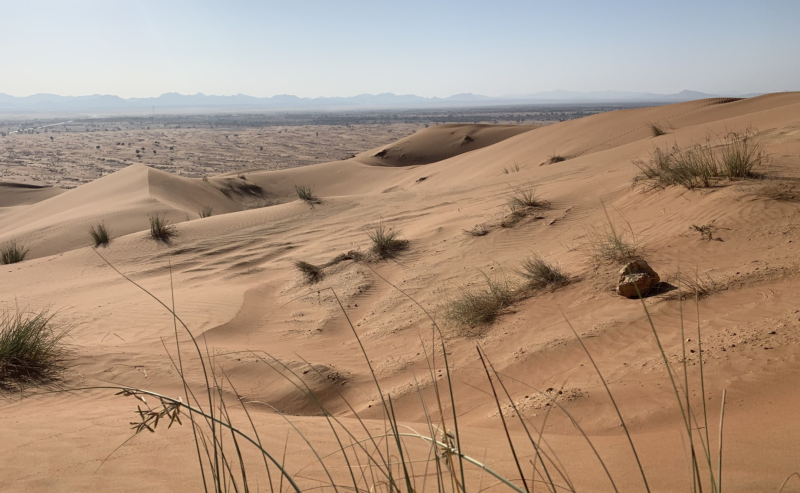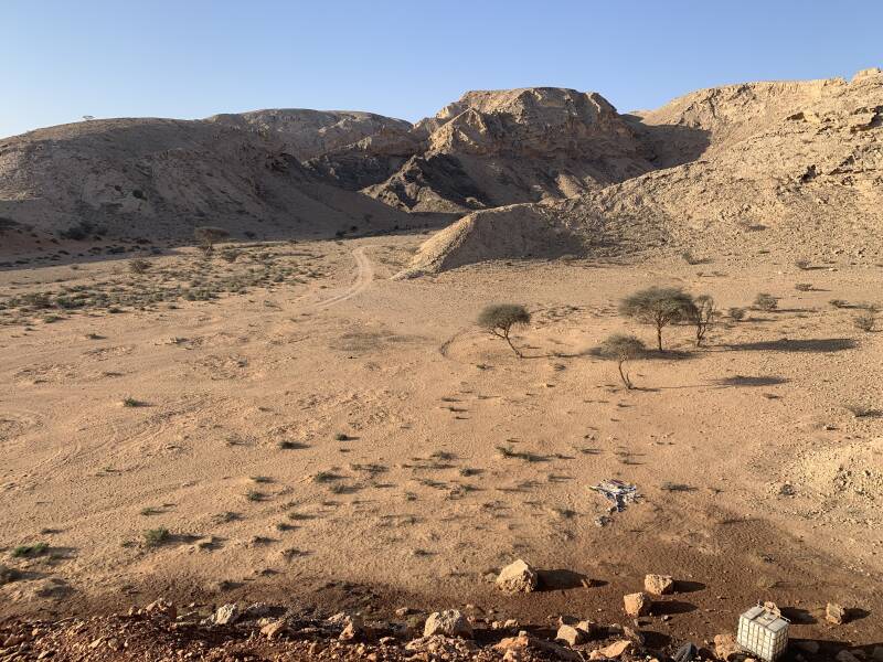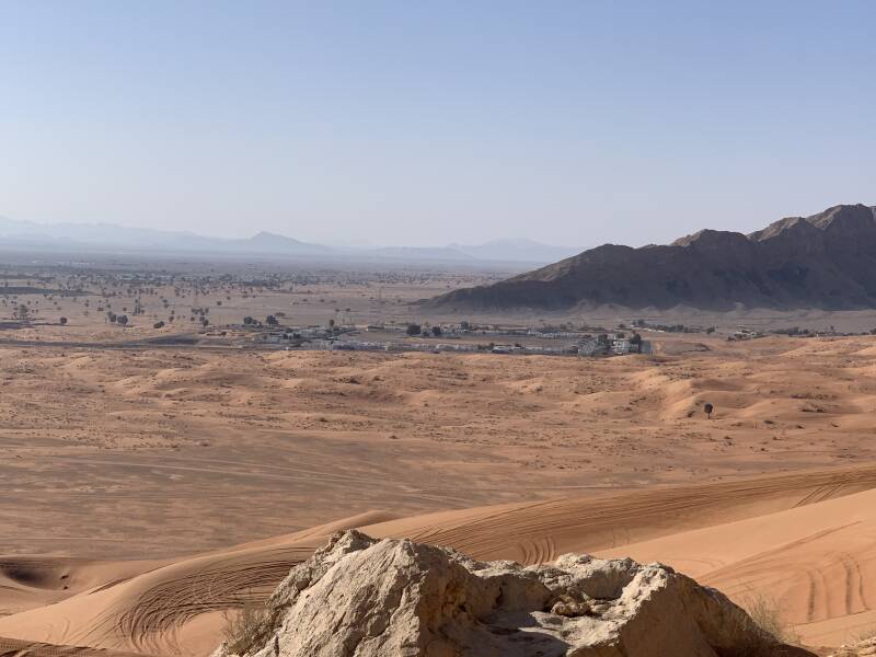 Mleiha Archaeological visitor centre (opened in 2016) provides an exhibition about the history and archaeology of the areas surrounding the village of Mleiha in Sharjah from the discoveries that are made over the past 40 years. It shows that 'anatomically modern humans' were in the Mleiha area between 130,000 and 120,000 years ago. The Centre is constructed around a 4,500 year old Umm Al Nar era Tomb from the Bronze Age. The village Mleiha is an UNESCO World Heritage Site. We didn't visit the centre but had a good view on it during our hike. It is a very striking place, because the village is situated in a square settlement with predominantly white buildings.