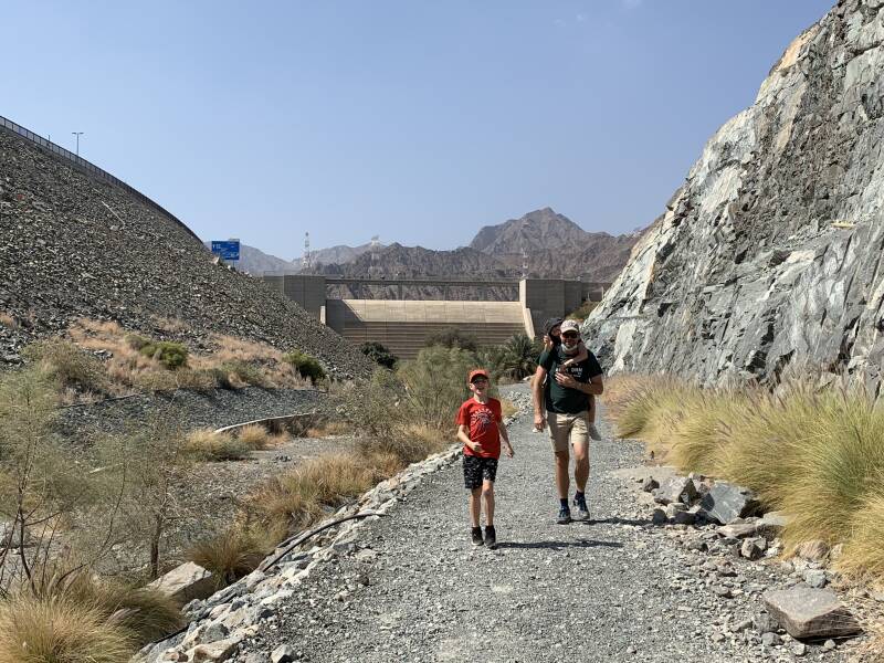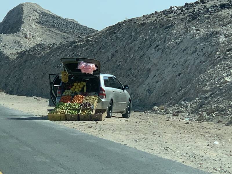 New (weekend) day, new trip outdoors! Today we went to Rafisah Dam in Sharjah. It is about 130 kilometers away from our home in Dubai, about 1 hour and 20 minutes drive. The drive to this part of the United Arab Emirates, is always a joy, because the landscape is changing into red dunes and rocky, jagged mountains. Along the way, we saw lots of cars with fruit 'trunk sales'. Most of them are people from India or Pakistan, who are trying to earn some money in the UAE.