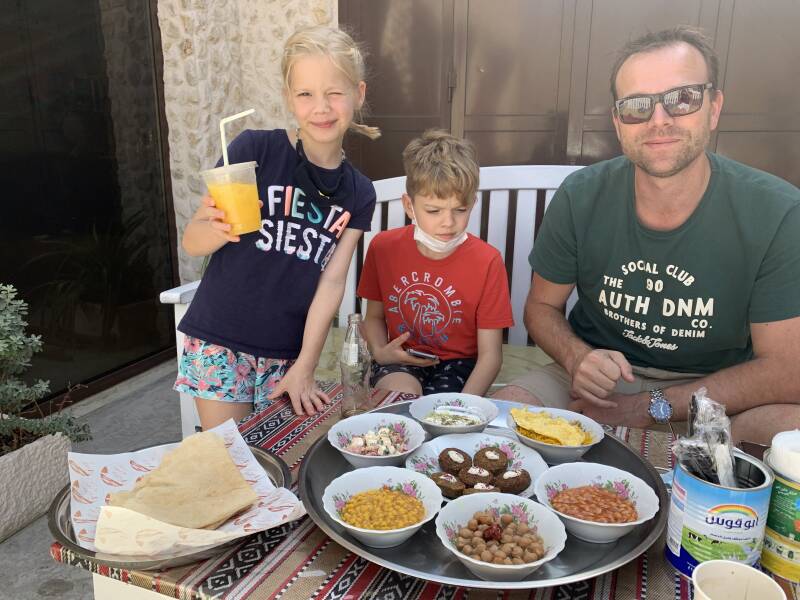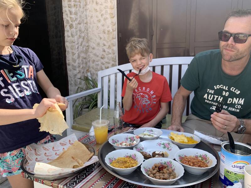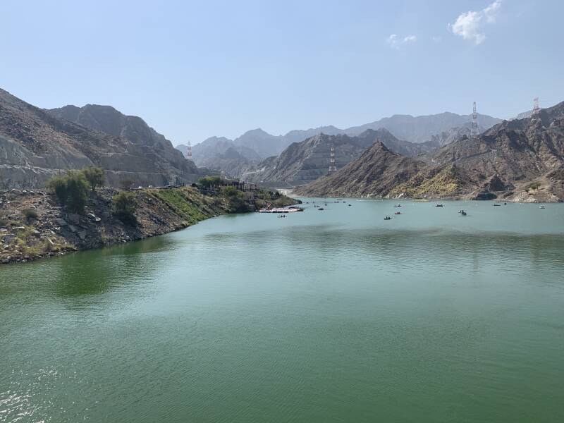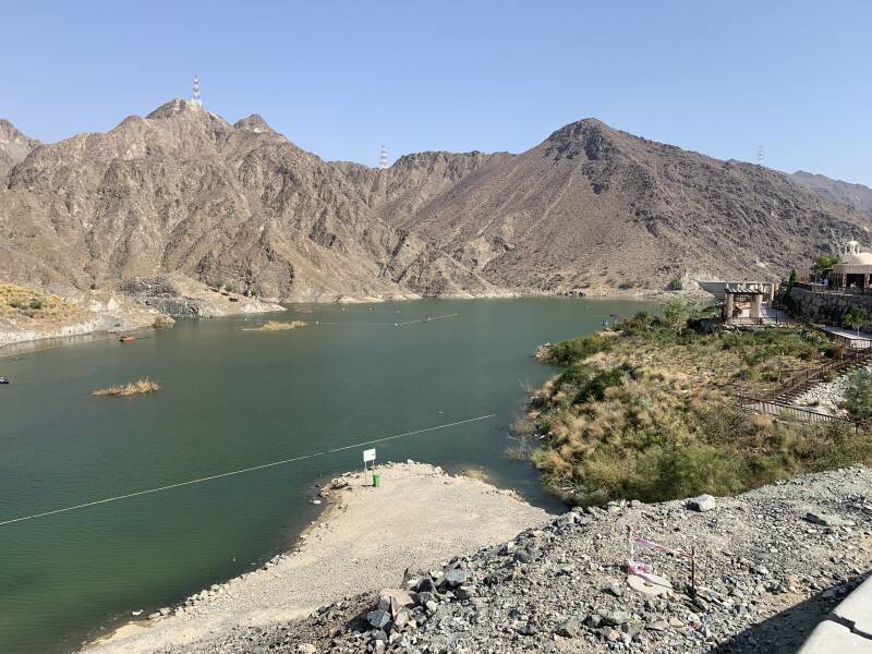 When we arrived at the Rafisah Dam Visitor's Parking, we all were very hungry, so we decided to start our hiking trip with a good, traditional Emirati breakfast, consisting of (among other things) chabab bread (Emirati pancake), balaleet with omelet, baidh tomato, salad, falafel balls and baked beans. Yummy! The restaurant (Rafisa Lounge Restaurant & Cafe) is situated at the lake, Hawd al Bid 'ah, which gives you a lovely view.