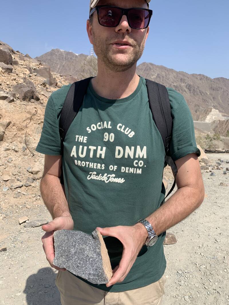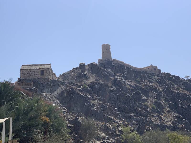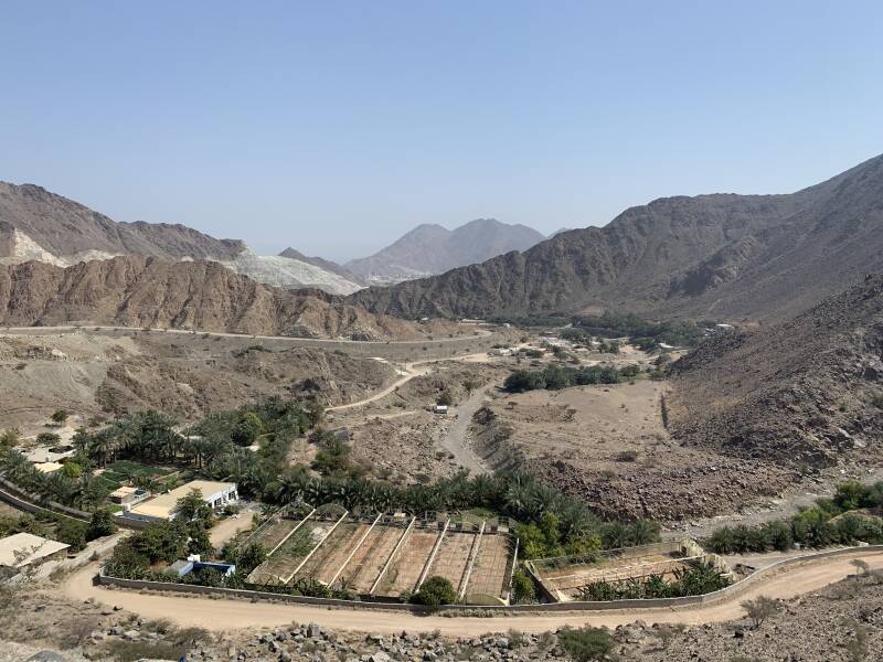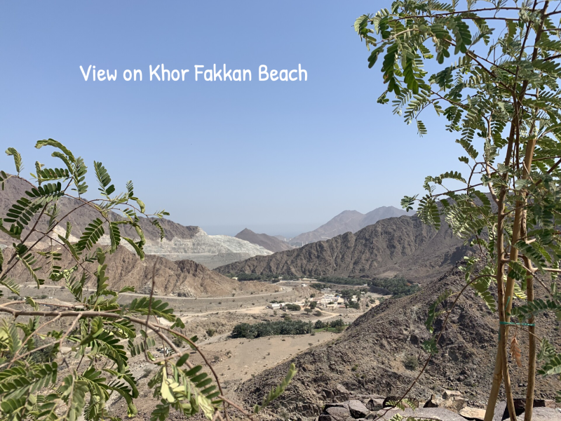 The viewing platform gives you a view over the valley to Khorfakkan Beach. In the valley we could see farms, the city Khorfakkan and the mosque. Beautiful. At this viewing point you can walk up to the castle / fort that was established nearly 300 years ago on the summit of the mountain, which was part of the defense network of Khorfakkan (it is still under reconstruction). The walk up to this point is beautiful with several views over different valleys. Along the road, we collected some nice granite stones (hobby of Dinand). After reaching the castle and having a look here, we went back to the lower situated viewing point, and walked back to the dam and to our car. As it was 2pm, we decided to go for another nice spot to complete our hiking day. We went to Wadi Shees, which was about 20 minutes driving from that point (another page on this web blog).