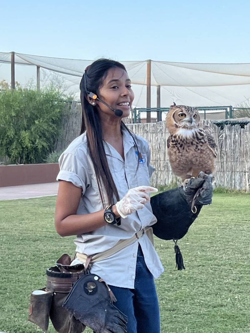 In the bird of prey centre, you can find all kind of raptors, such as the resident bird, the falcon, the national bird of the UAE, and migrating wild raptors, like the barn owl, short toad snake eagle, greater spotted eagle, and lappet faced vulture.