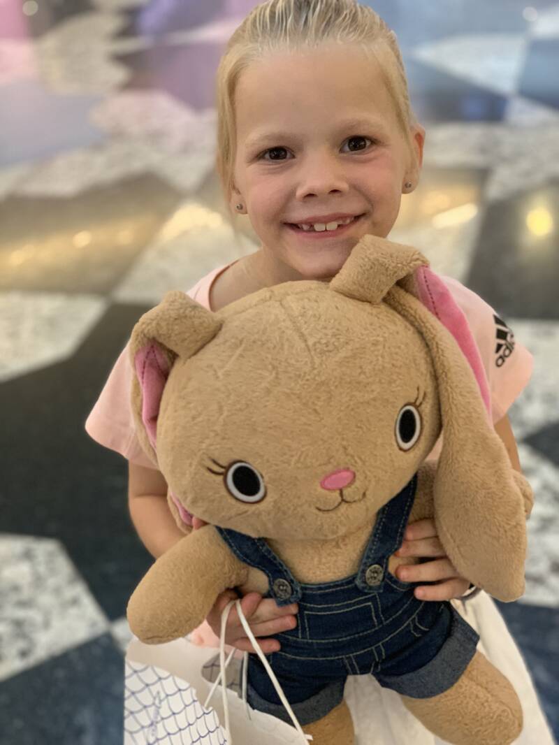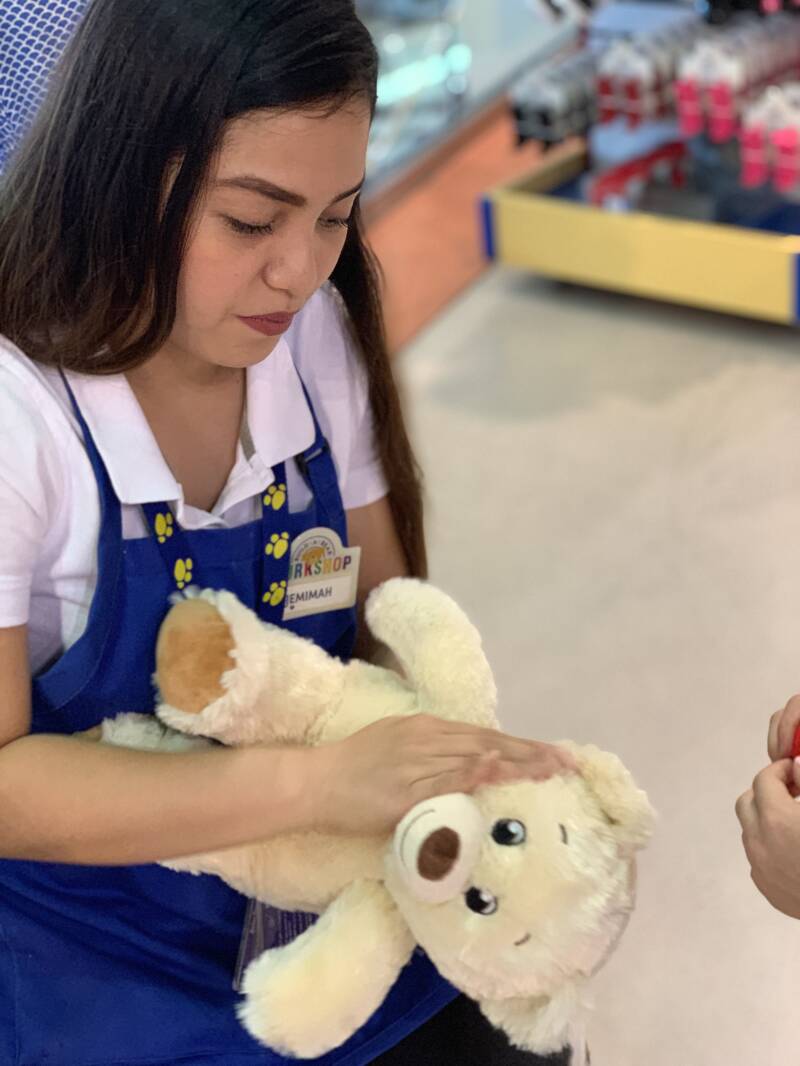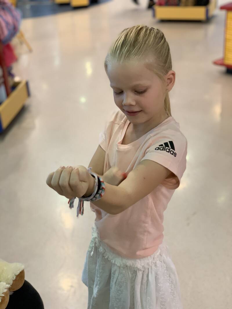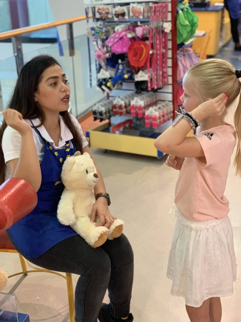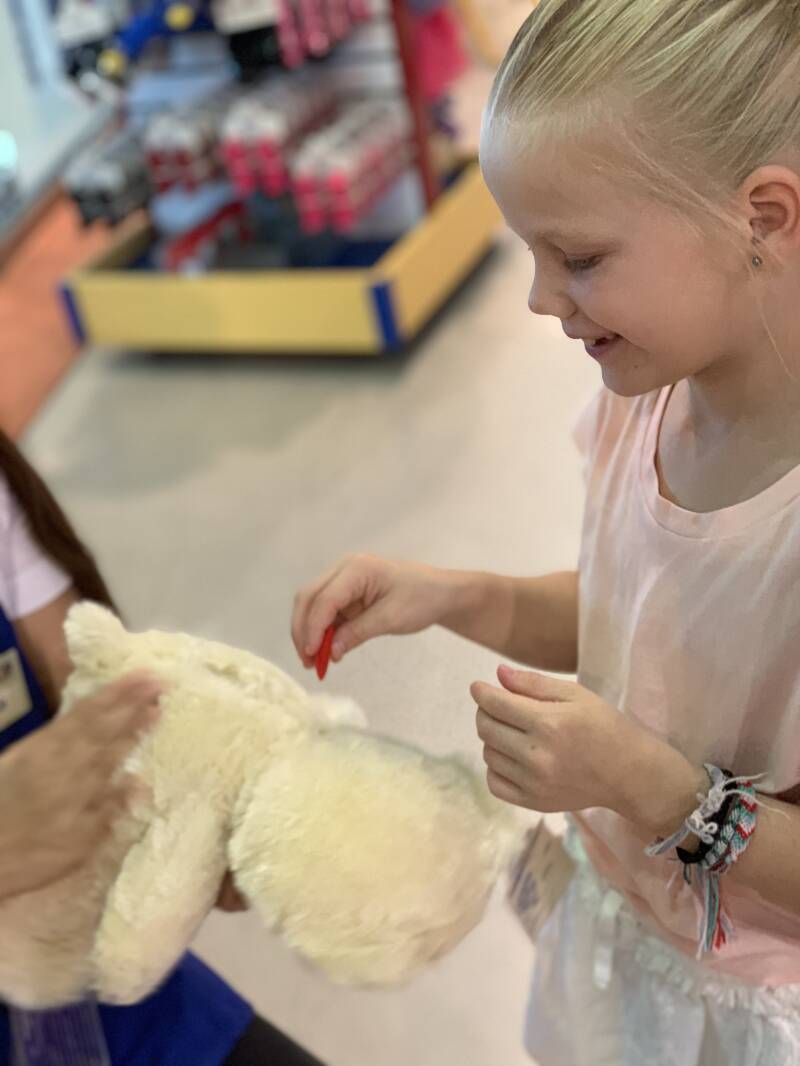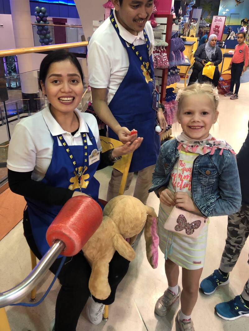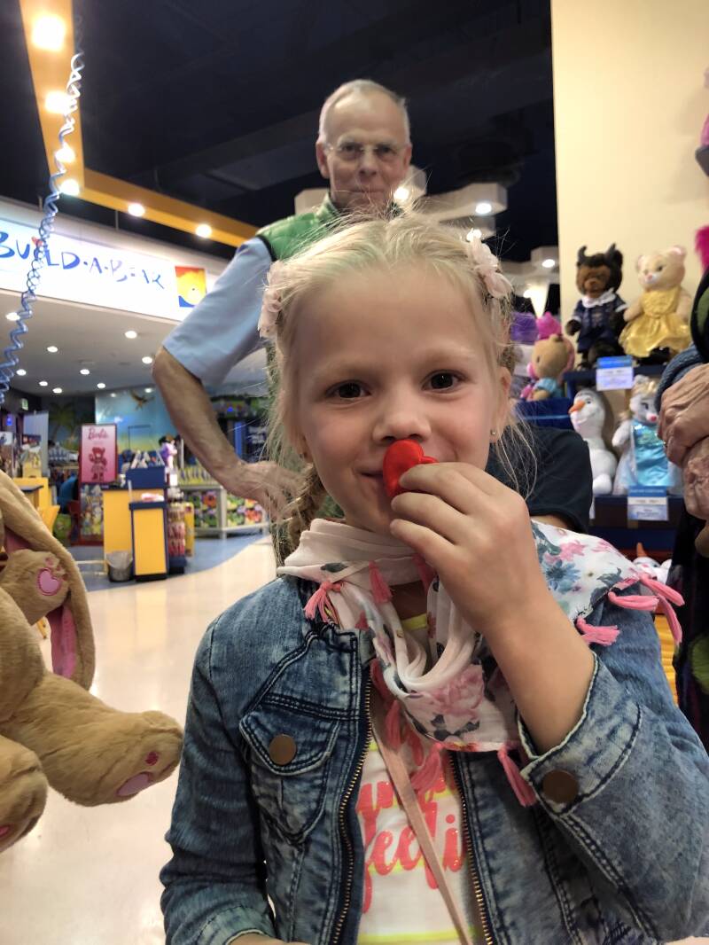 The Build-A-Bear concept is as following: you choose a teddy, which it's not filled yet. The BAB workers make it come 'alive' on the spot. They fill it up, it gets a 'real heart' (on which all members of the family have to give a kiss and make a wish) and you can add other things like a smell and a sound. When this is finished, you have to fill in the birth certificate, with the Teddies' name, day of birth, owner, etc., all very thoughtful. After that you can buy clothes, and many (expensive) accessories. Lieke has chosen three bears already and each time the workshop was great fun. Her teddies are: Fluffy, Freddy and Fransje ;-)