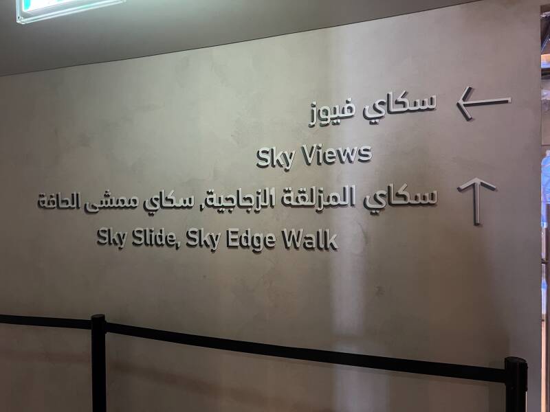 Sky Views is located on the 52nd and 53rd floor of the Address Sky View Hotel. It is accessible from the metro station, Burj Khalifa/Dubai Mall, very convenient. A panoramic glass elevator takes you up to 219,5 meters. There is also a nice restaurant (Sky 52), where you can watch the sliding daredevils pass by while drinking you coffee.