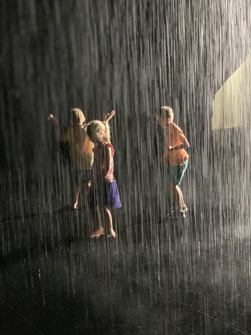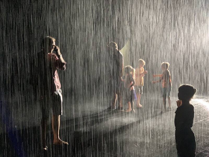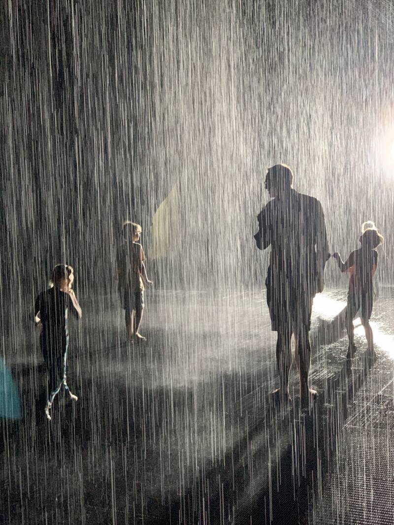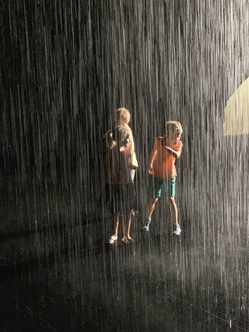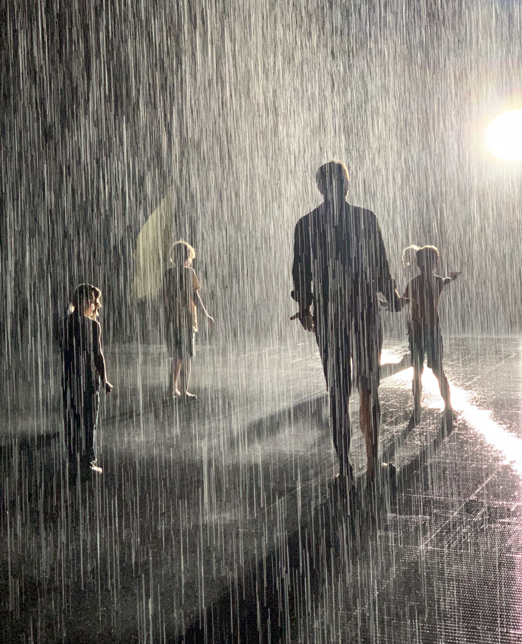 The Sharjah Art foundation - Rain Room (2012) is very special, as you to walk through a downpour of continuous rain without getting wet. How it works? The responsive environment follows you as you navigate through the underground space, preventing the rain from falling directly above any detected human presence. We did this trip with our friends, Gideon, Mascha, Krijn and Nina and it was particular pleasant, as the temperature outside was 40+ degrees. After a while, the children started to run and dance, and they got soaking wet, because the technic only works when you walk slowly. Outside they were dry in 10 minutes ;-). We combined this trip with a lunch at Jones The Grocer on Flag Island Sharjah.