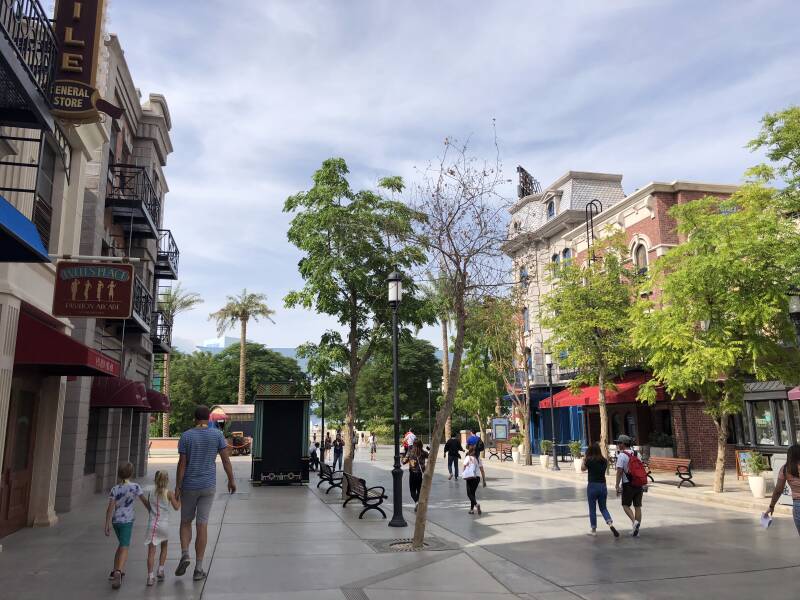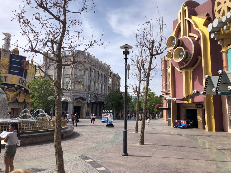 After entering the park, we arrive into the central theme area, Studio Central. We imagine ourselves on the film set of a simulated street in New York City with stately buildings in which shops, offices, cafes and restaurants are located. It looks very attractive. At the fork to the other 4 theme areas of Motiongate, we turn right to "The adventurous world of Columbia Pictures".