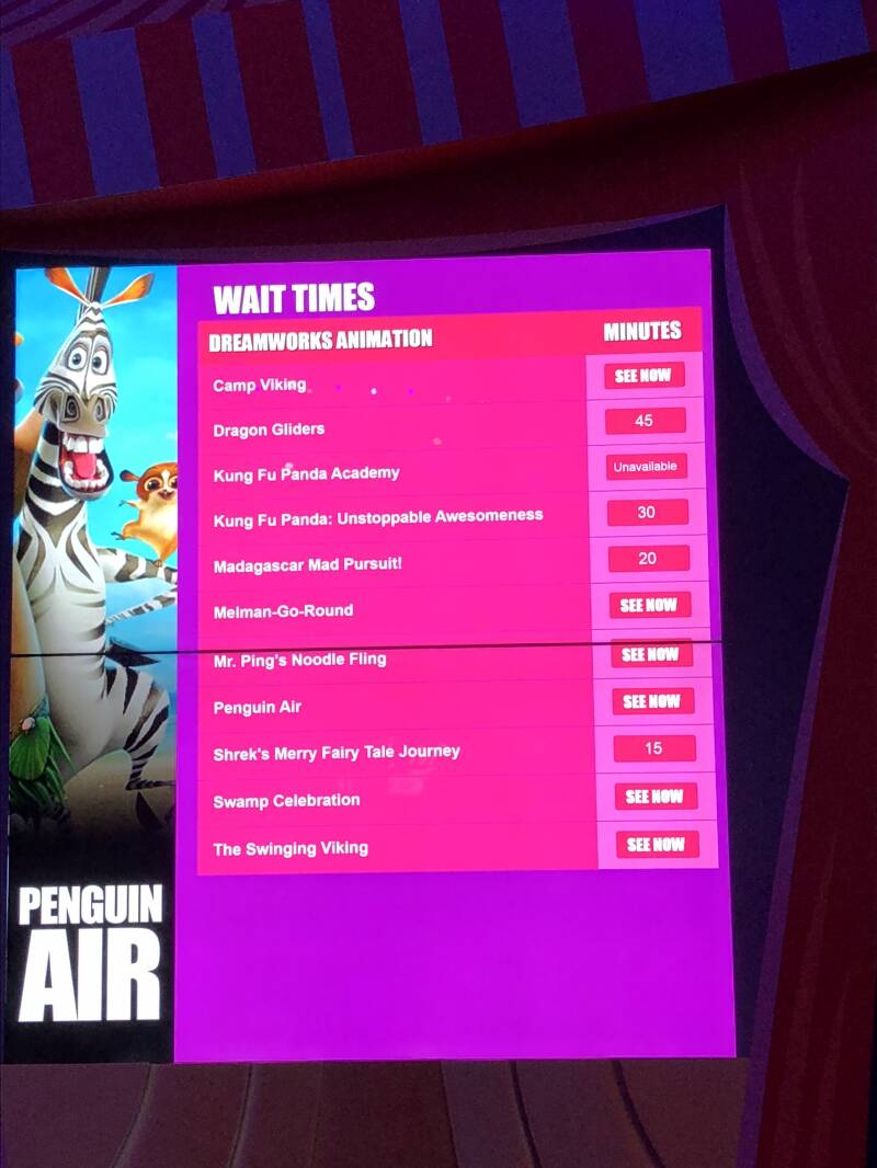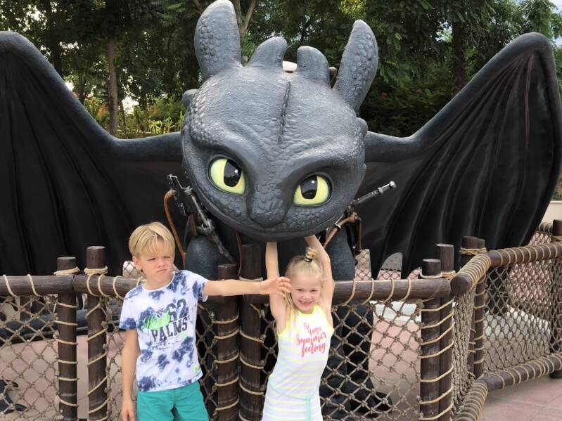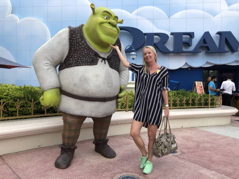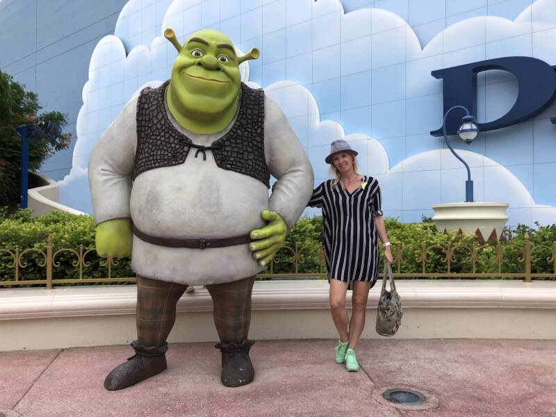 We have now arrived in the third theme area, Dreamworks. This themed area is realized in a large blue dome, which also provides the necessary cooling on hot days. The dome is the house where Shrek, Madagascar, 'How To Train Your Dragon' and Kung Fu Panda come to life. Very nice is Shreks' Merry Fairy Tale Journey, an eight-minute ride that tells the story of Shrek and Fiona through a nostalgic puppet theater. We just love it and we have become even bigger Shrek fans than we already were. Of course we got our picture taken with Shrek and Fiona when the opportunity arose!