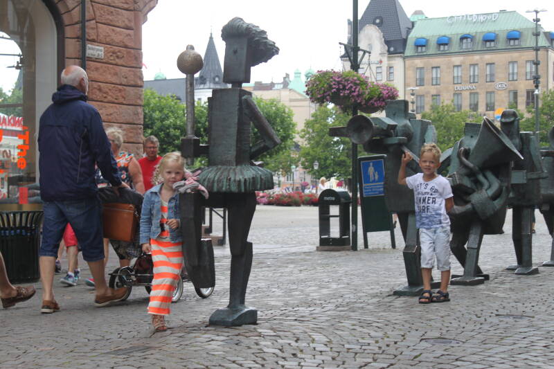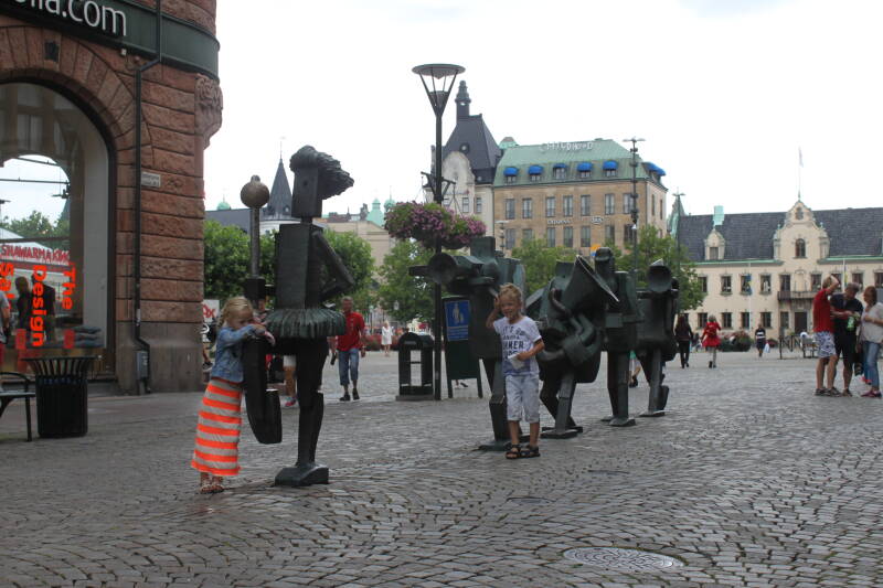 Then we walked to the center of the city and came across the funny sculptures of the 'Optimistorketern'; this series of images is a famous landmark of Malmo located in the city center on Södergatan. It is an ensemble of sculptures representing an orchestra that marches on the pedestrian part of the street. The author of this outrageous sculpture is Yngve Lundell. This artist was born and raised in Malmo and always dreamed of making this city more attractive, so in 1985 he created the famous bronze sculpture. It is a popular spot for taking photos and is loved by both tourists and locals.