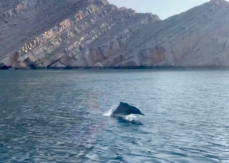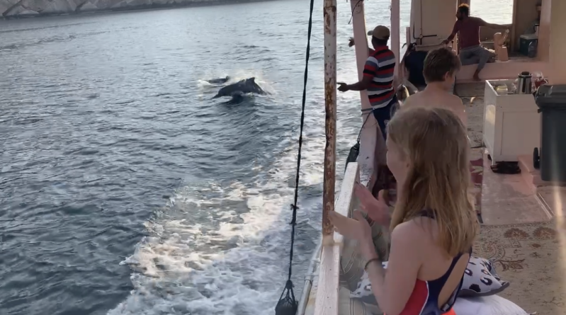 But the absolute highlight of the trip was watching the dolphins. Out on the calm, blue waters off Khasab in Musandam, we were suddenly surrounded by them—dozens at a time—moving effortlessly through the sea. They appeared as if from nowhere, their sleek bodies cutting through the water with elegance and speed.
