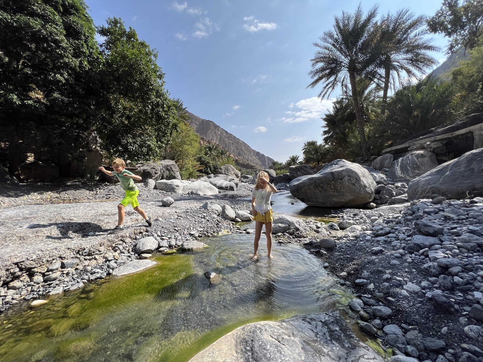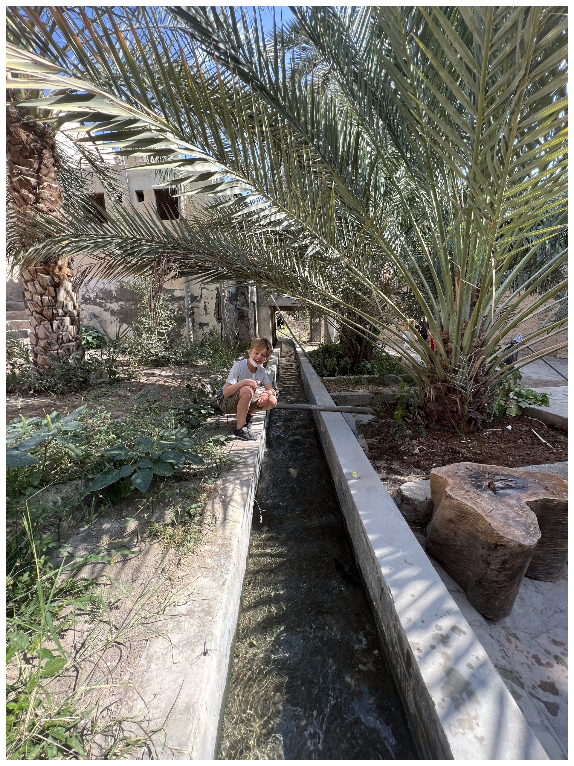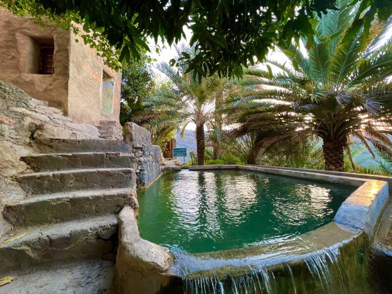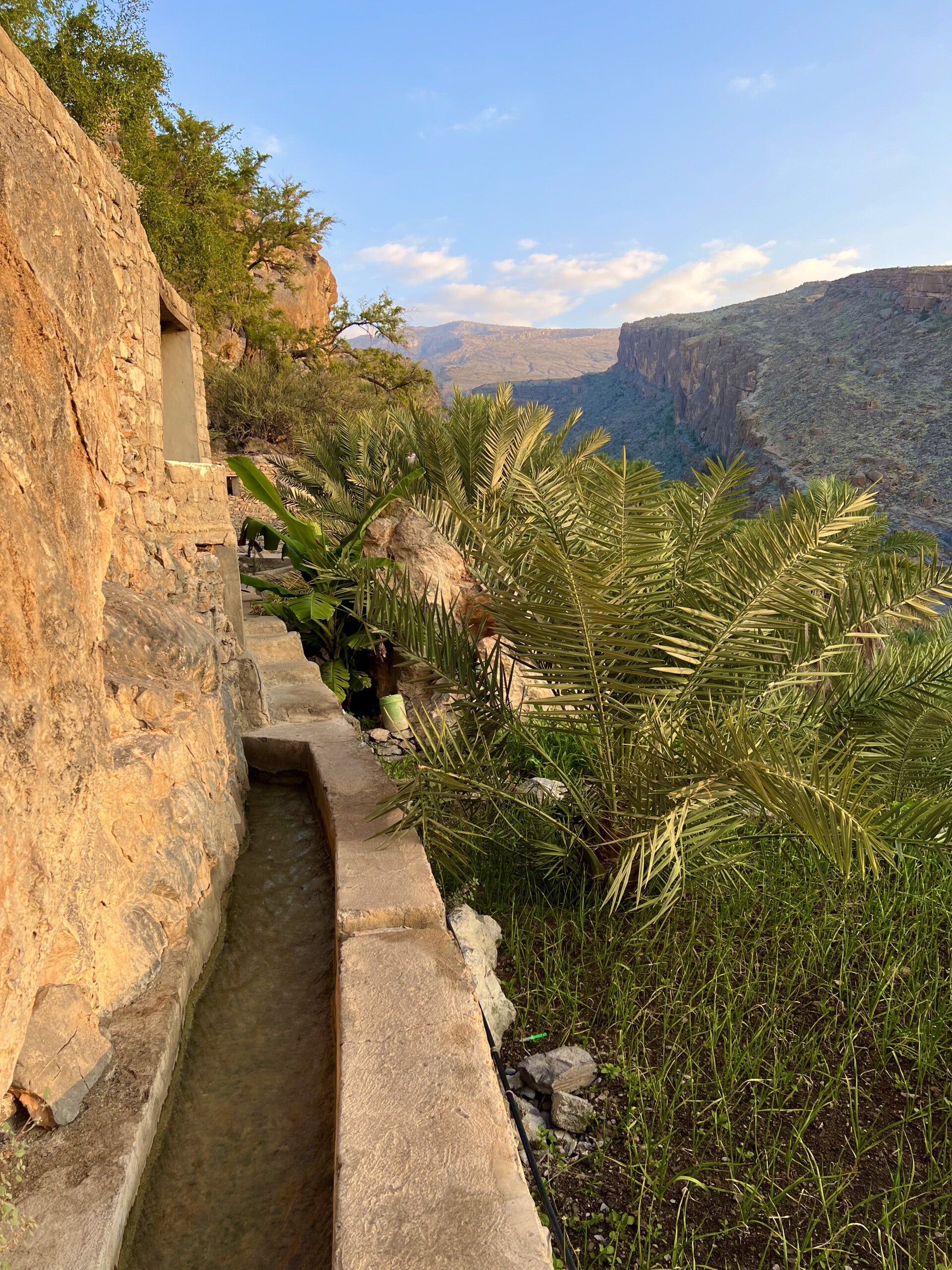 Essentially, it is a winding channel carved into the mountainside that carries fresh spring water from higher up the mountain down to the terrace gardens, where dates, mangoes, and other trees are grown.
