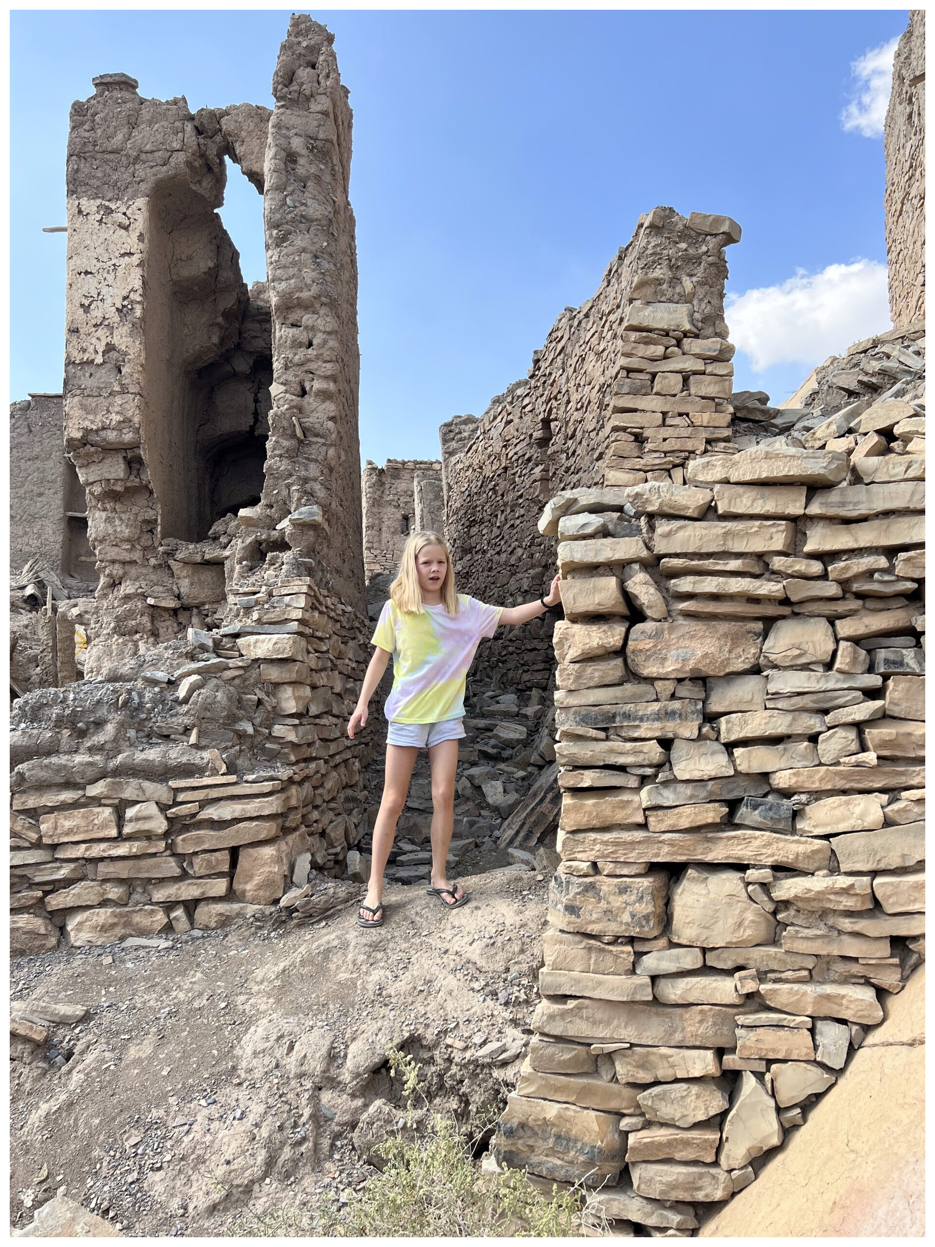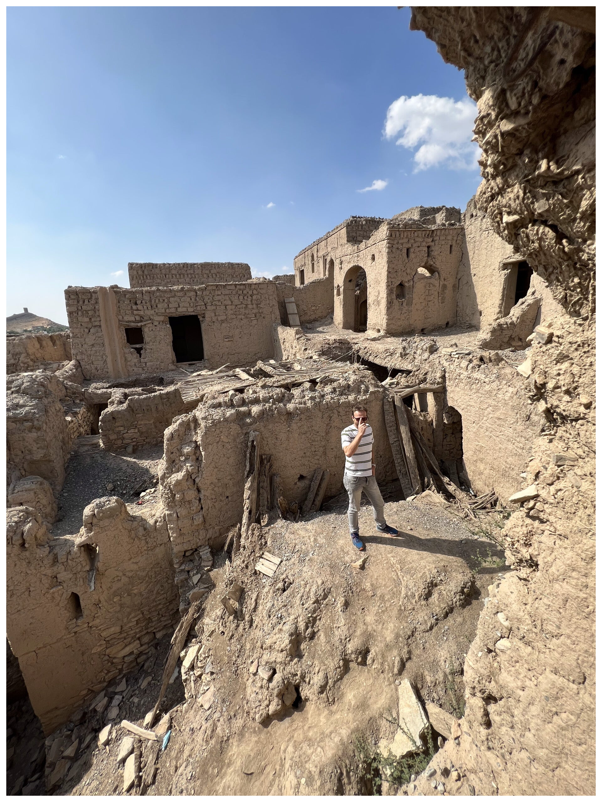 The ruins themselves are spread across a small hillside, with crumbling walls, old doorways, and roofless houses built from local stone and mud. Walking through the remains, it is easy to imagine what daily life once looked like here—families living close together, children playing in the narrow paths, and farmers tending their terraces.