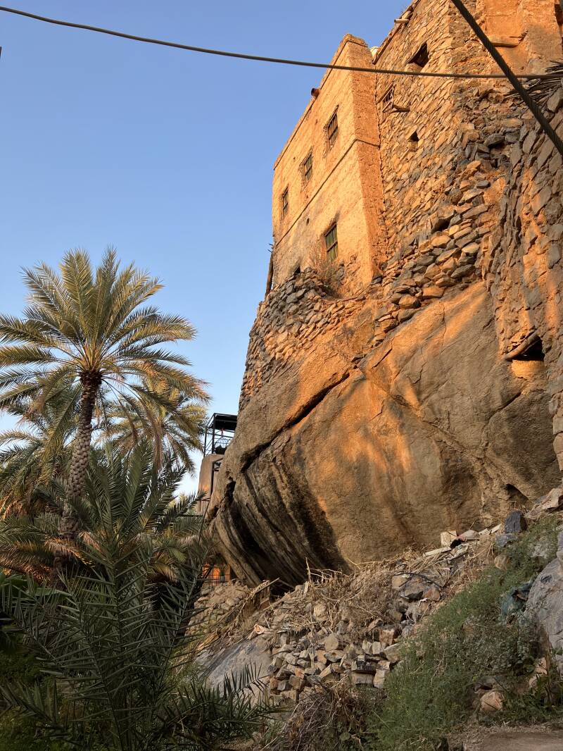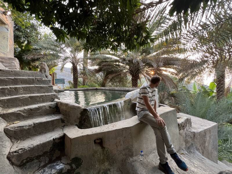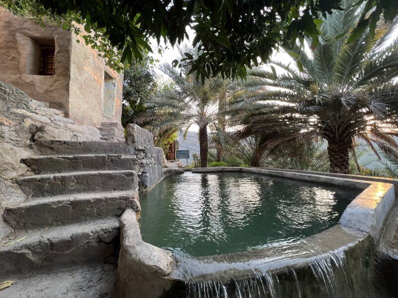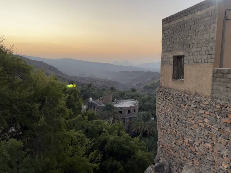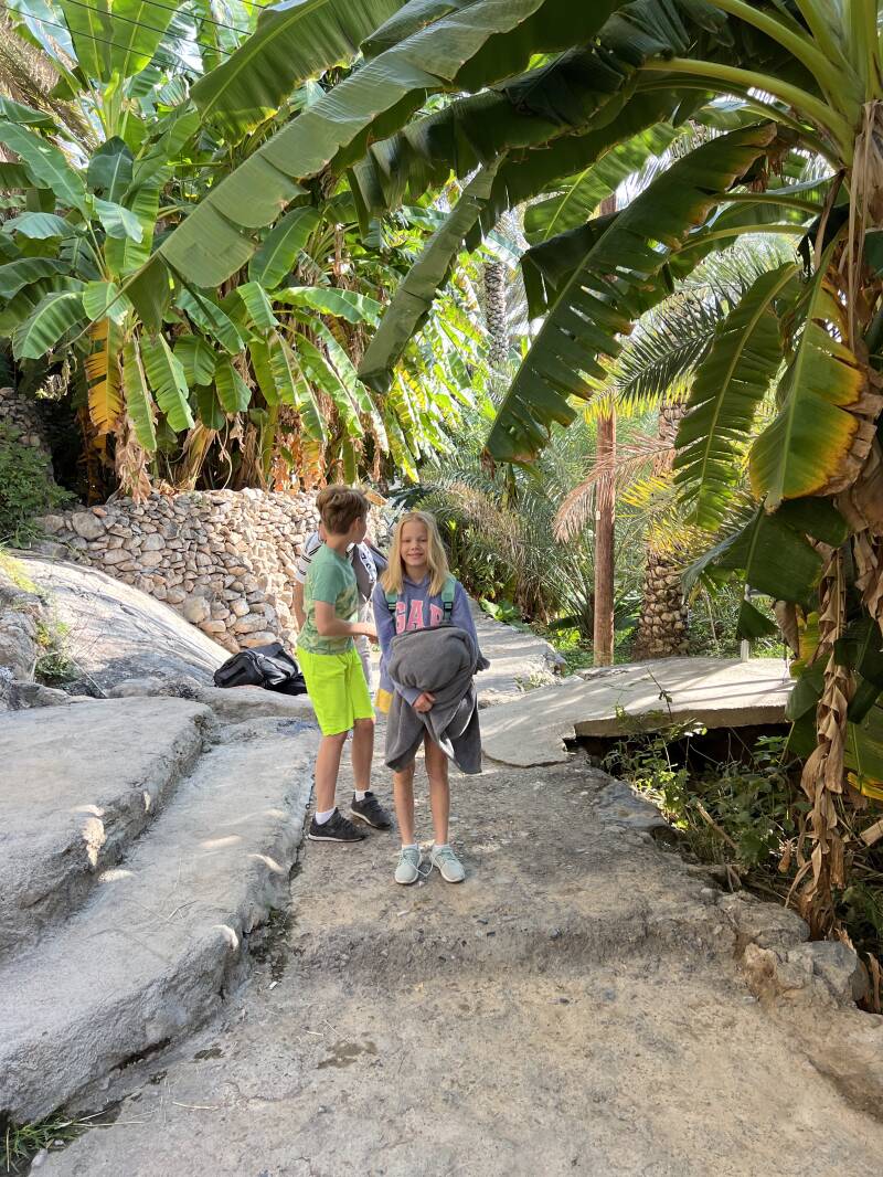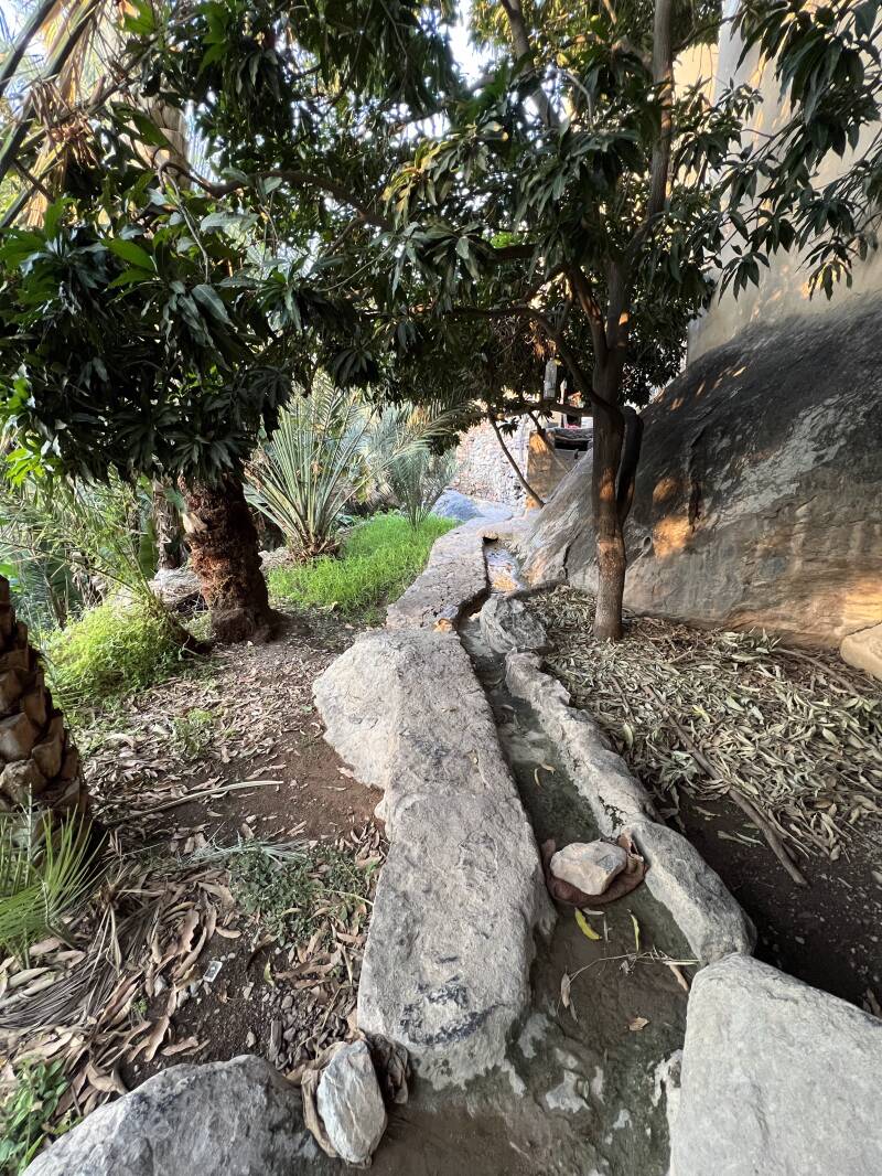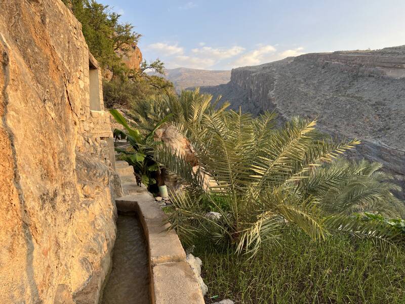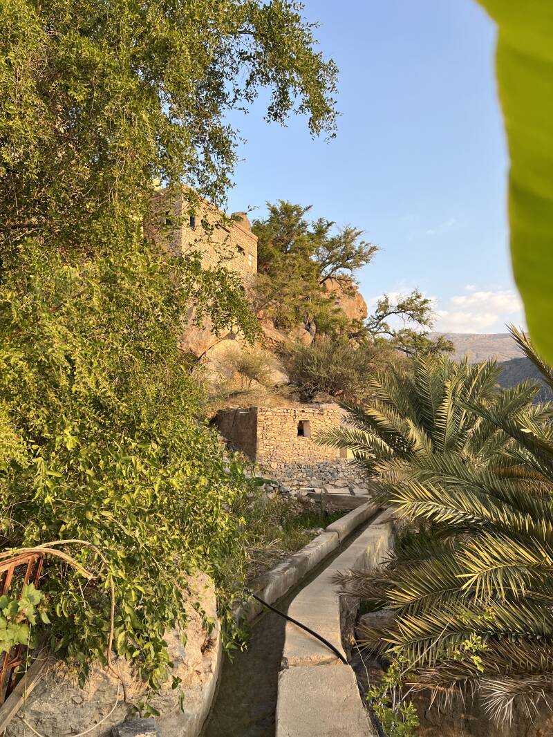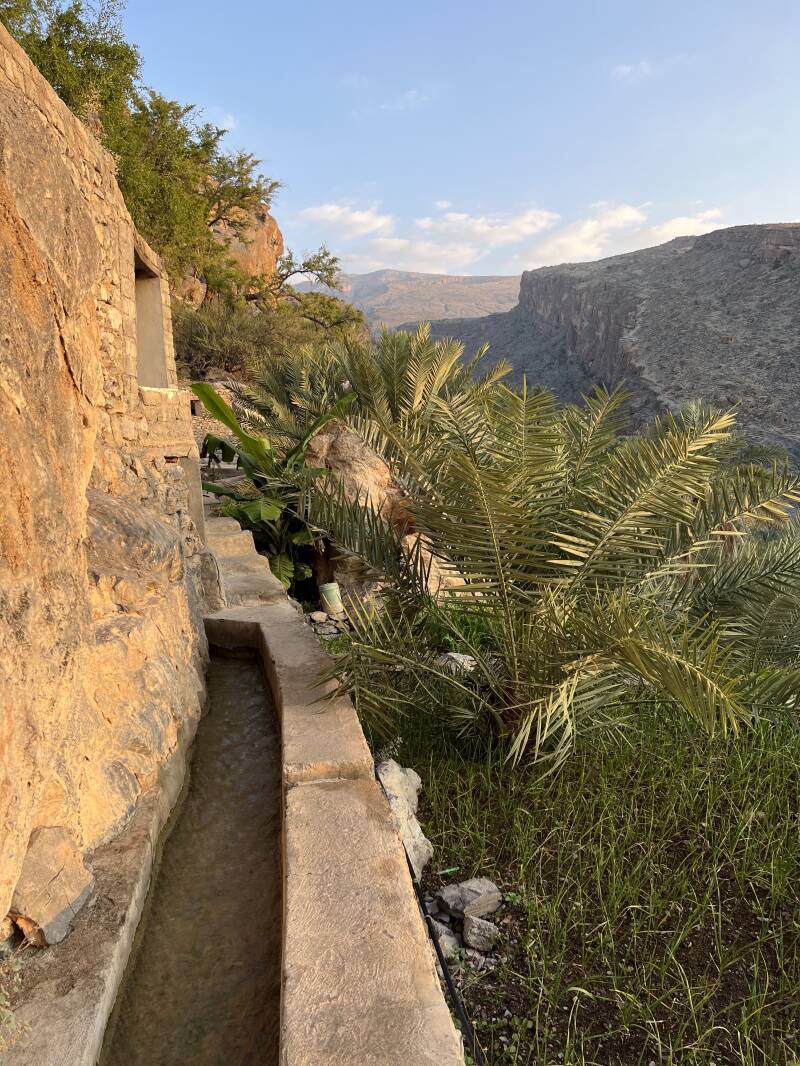 The terraces make use of a centuries-old irrigation system known as Falaj. This is essentially a winding river that has been carved into the rock of the mountain that transports fresh spring water. It runs from higher in the mountain, down into the terrace gardens where the dates, mangoes and other trees are cultivated.