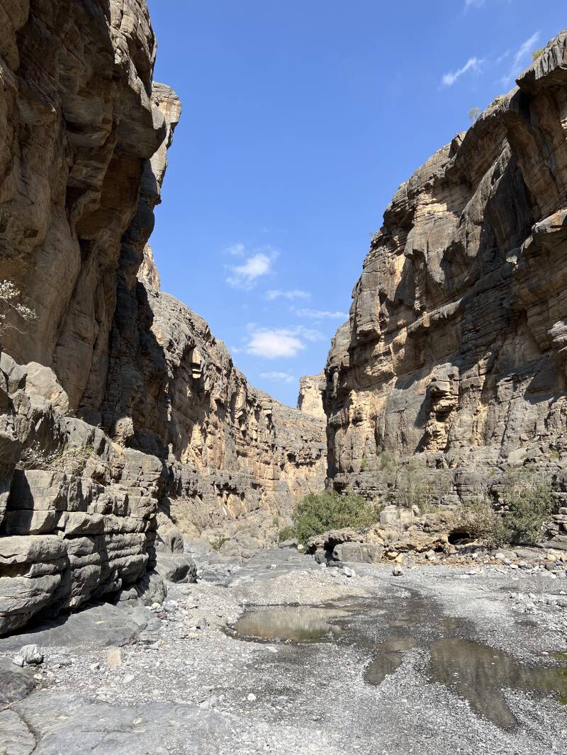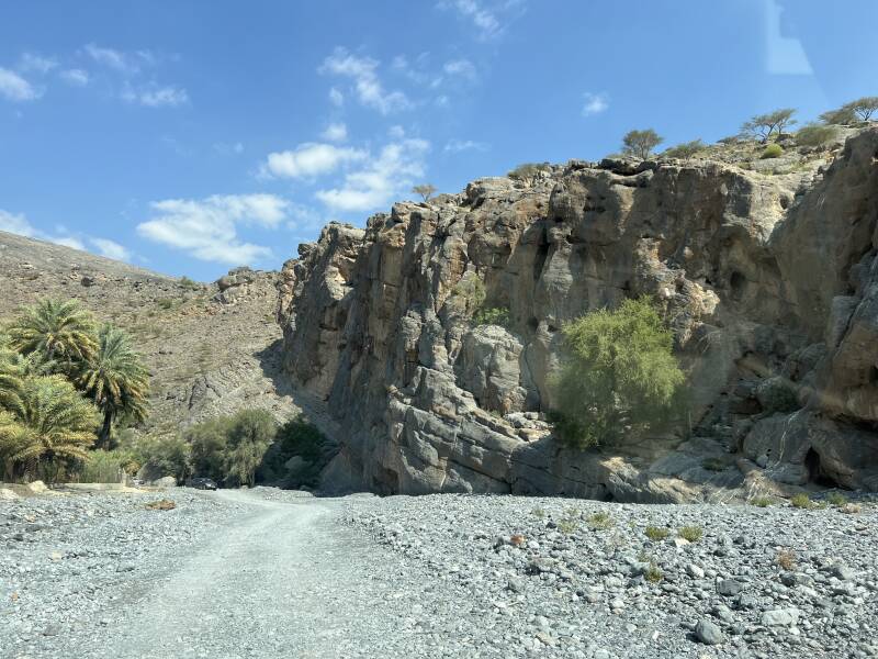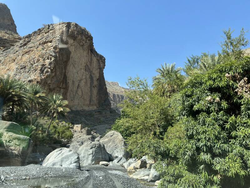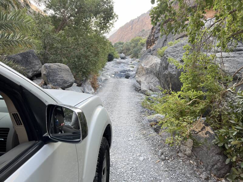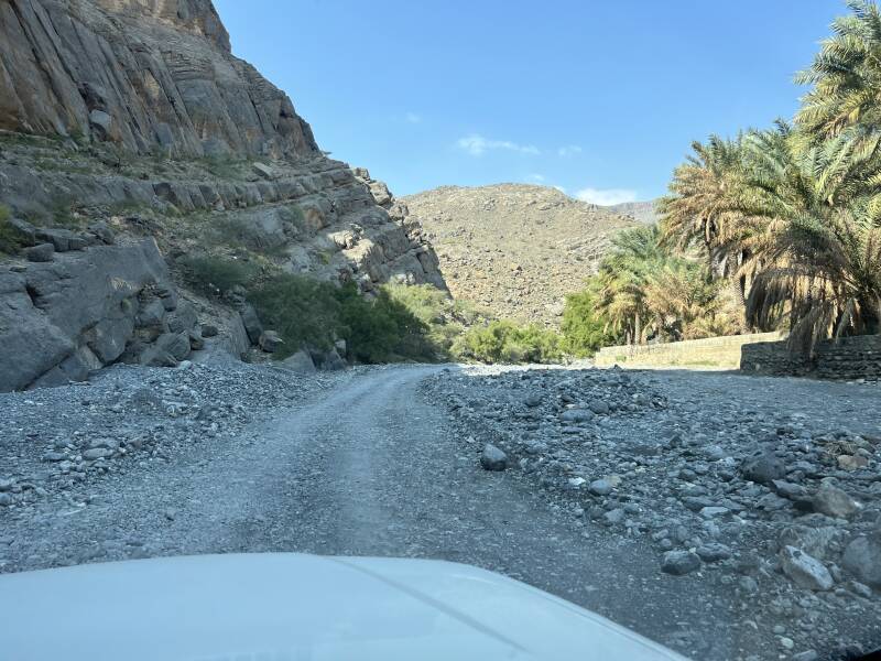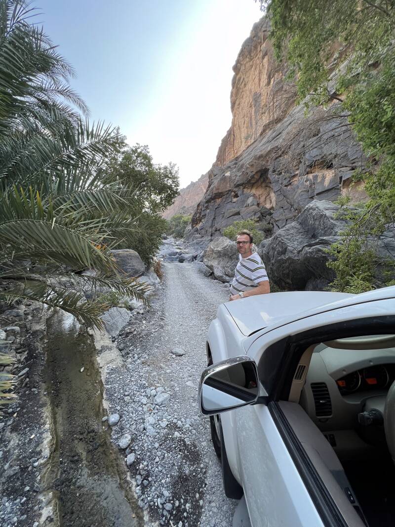 The route from the main road (parking: 23.1491632, 57.2038475), starts with a steep path down, which takes you to a huge gravel plain (Valley Necrosis), you follow the (ridden) path towards the gorge, after which it gets narrower and rougher, through small oases, past large boulders, farms, old (looked abandoned) villages, palm trees, water irrigation system, goats, be hardly able to take it all in.