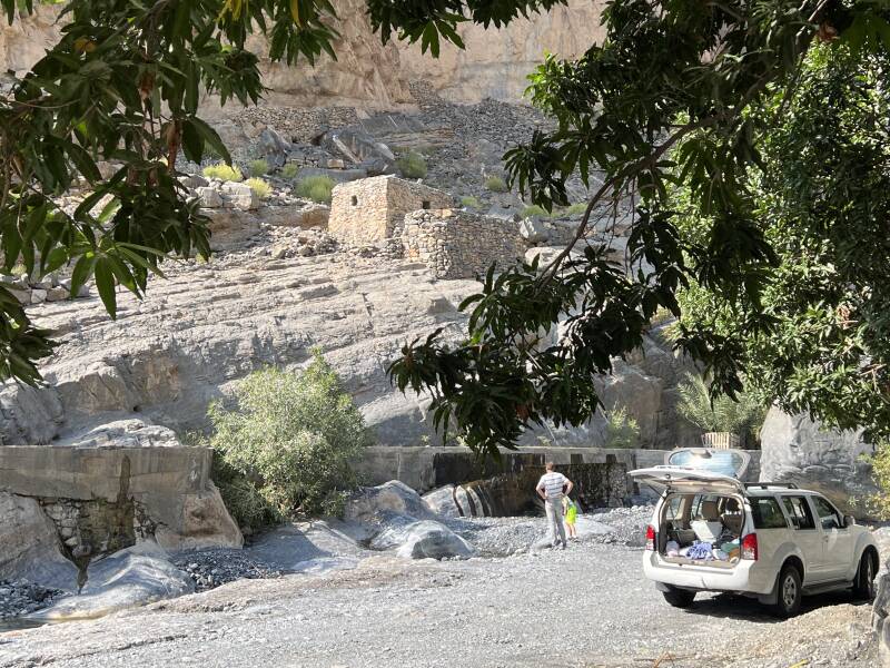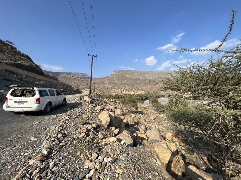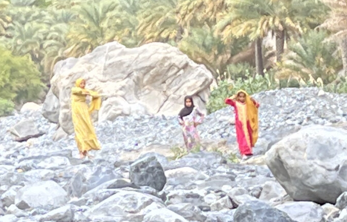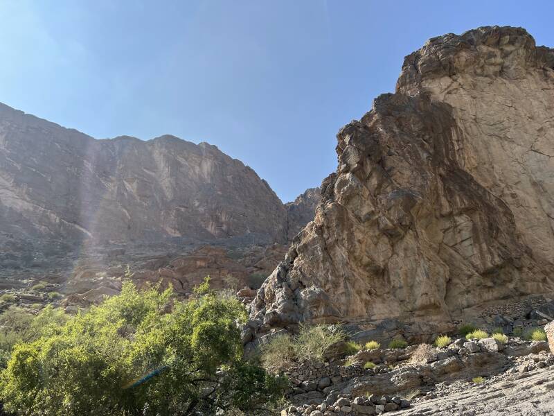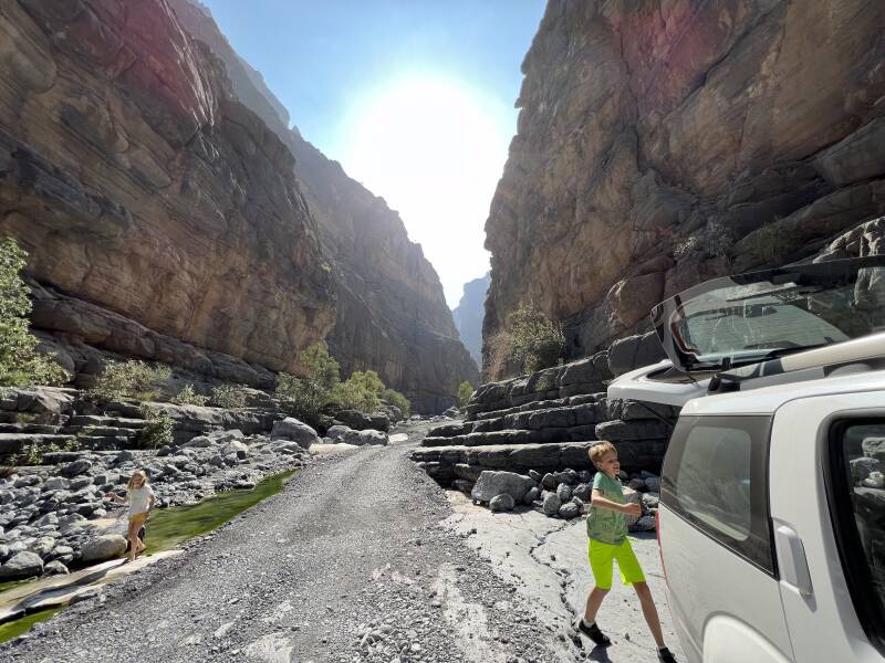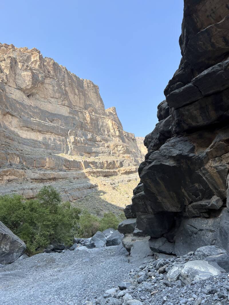 The route from the main road (parking: 23.1491632, 57.2038475), starts with a steep path down, which takes you to a huge gravel plain (Valley Necrosis), you follow the (ridden) path towards the gorge, after which it gets narrower and rougher, through small oases, past large boulders, farms, old (looked abandoned) villages, palm trees, water irrigation system, goats, be hardly able to take it all in.